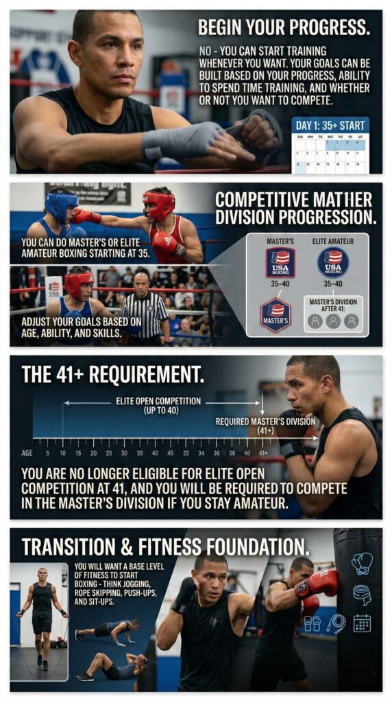 NO – you can start training whenever you want. Your goals can be built based on your progress, ability to spend time training, and whether or not you want to compete. You can do Master’s or Elite Amateur boxing starting at 35. You are no longer eligible the Elite open competition at 41, and you will be required to compete in the Masters division if you stay amateur. You can turn pro if this suits your goals at any point, although it’s less common after your late 30’s or 40’s. Adjust your goals based on age, ability, and skills. You will want a base level of fitness to start boxing – think jogging, rope skipping, push-ups, and sit-ups. You don’t have to be boxing fit, but you should be fit